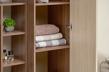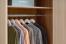 Здесь удобно: шкаф со штангой для одежды (рубашки, платья — не мнутся), отдельные полки под бельё, и пенал для стопок книг или коробок с документами. Десять открытых полок — для фото, техники, декора, чтобы не искать нужное по ящикам. Всё разложено по категориям, не перемешивается, нет ощущения захламлённости — даже если семья большая.