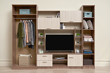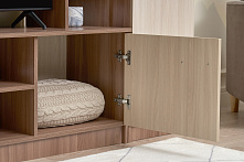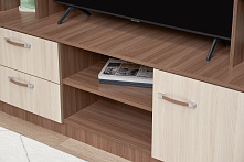 Под телевизор — ниша 100×80 см: влезает стандартный ТВ, ещё остаётся место по бокам для приставки или роутера. Провода можно аккуратно спрятать за задней стенкой, не тянуть по всему залу. Ящики под нишей — для пультов, зарядок, мелочей, которые обычно теряются на виду.