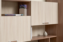 Светлые фасады и зеркало на шкафу работают на «освежение» пространства — комната визуально просторнее, даже если окно не на солнечной стороне. Две расцветки (венге + белфорт, ясень шимо) подходят и к спокойным, и к контрастным интерьерам, не спорят с остальной мебелью. Нет ощущения, что стена перегружена или «давит».