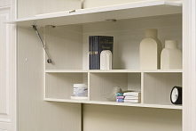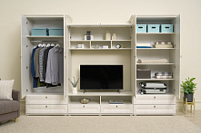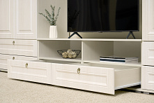 Особое внимание уделено нише для телевизора шириной 140 см, позволяющей разместить современные устройства, сохраняя общий стиль. Отсутствие витрины придаёт стенке минималистичный вид и актуальность. Все детали для интеграции техники уже учтены в конструкции.