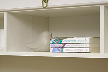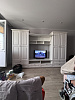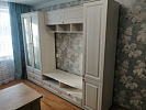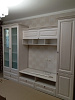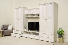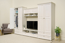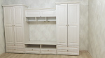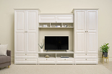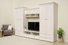 Стенка выполнена в классическом стиле, который прекрасно вписывается в атмосферу уютной гостиной. Красивые фасады с фрезеровкой подчёркивают внимание к деталям, придавая комнате солидный и элегантный вид.