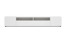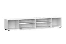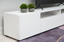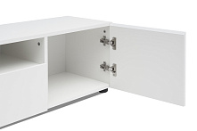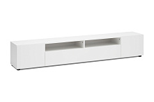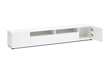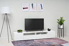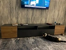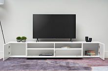 Длина в 200 см — сюда спокойно встанет крупный телевизор, музыкальная колонка, игровая приставка и пара рамок или декора. Внутри три секции за дверцами — сюда уходит всё, что обычно мешает: провода, пульты, диски, комплект зарядок, даже стопки журналов или настольные игры. Открытые полки — для приставки или роутера, где нужен быстрый доступ и проветривание.