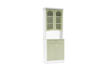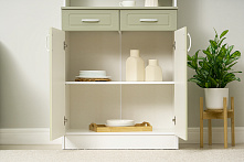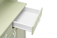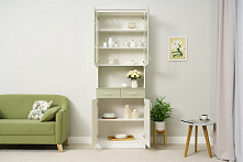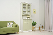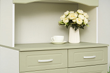 Цветовая комбинация фисташковых фасадов и белого корпуса добавляет лёгкости и свежести, что делает буфет отличным выбором для светлых кухонь или гостиных. Спокойные тона буфета создают уютную атмосферу и не привлекают чрезмерное внимание, оставляя пространство гармоничным.