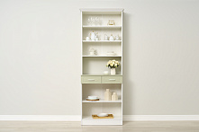 Этот буфет размерами шириной 80 см и высотой 225 см подходит даже для небольших помещений, обеспечивая достаточное пространство для хранения. В двух ящиках можно удобно разместить посуду, столовые приборы или текстиль. Фасады из МДФ, без глянца, минимизируют блики при ярком освещении.