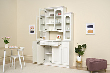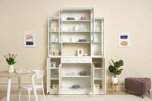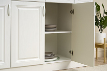 Четыре створки обеспечивают достаточно места для хранения посуды, бокалов и даже бытовых приборов. Можно легко организовать доступ к нужным вещам, при этом сохраняя их скрытыми из вида. Размеры 140 см в ширину и 43 см в глубину позволяют удобно расположить буфет вдоль стены, не сужая проход.