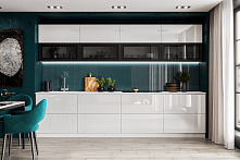 Фасады гарнитура не комплектуются ручками, но имеют с обратной стороны глухие отверстия рассчитанные на установку ручек 128 мм.