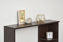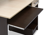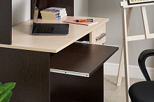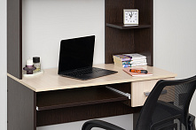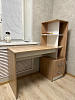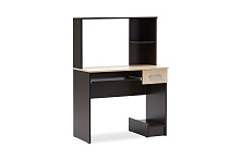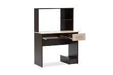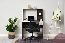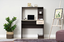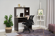 Этот стол имеет компактные размеры — всего 90 см в ширину. Он оснащён полками и ящиком, позволяющими удобно разместить монитор, клавиатуру и несколько книг. Под столом есть место для системного блока, а на верхних полках — для дополнительных аксессуаров или декоративных элементов. Этот стол не предназначен для больших рабочих станций, но обеспечивает комфортное размещение всего необходимого в ограниченном пространстве.