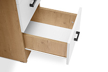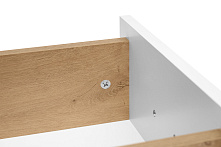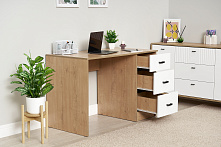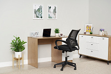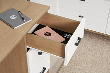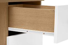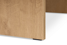 Корпус стола изготовлен из ЛДСП с декором под древесину дуба вотан, что придаёт ему натуральный и уютный вид. Тёплый оттенок удачно сочетается с белыми глянцевыми фасадами. Поверхность визуально приятна и ненавязчива, особенно когда стол расположен у окна.