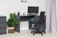 Ширины в 130 см хватает, чтобы спокойно разместить ноутбук или монитор и оставить свободное пространство для записи, книг или даже лампы. Благодаря глубине 90 см стол не занимает полкомнаты, но на нем не будет тесно — особенно если часто приходится разложиться с учебниками или бумагами. Рабочая зона не «съедает» угол, а использует пространство по максимуму.