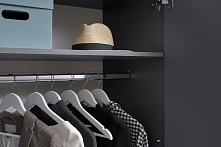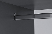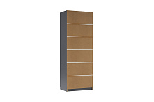 Графитовый цвет фасадов и корпуса погружают в атмосферу сдержанной элегантности. Хотя шкаф не имеет глянцевого покрытия, его чистота линий и текстура древесного материала делают его идеальным выбором для современных интерьеров.