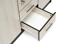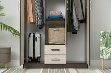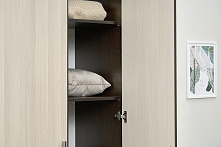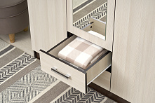 Шкаф оснащён двумя ящиками для хранения белья и аксессуаров, что позволяет держать всё под рукой и в идеальном порядке. Полки предоставляют дополнительное место для сложенной одежды или постельных принадлежностей, делая контроль и упорядочивание вещей простым занятием.