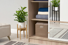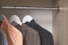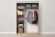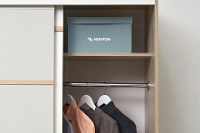 В этом шкафу всё просто — полки и штанга, чтобы легко разложить и развесить одежду. Штанга для одежды вмещает длинные платья и пальто, а вверху есть пространство для чемоданов или больших коробок. Нет ящиков — зато ничего не теряется в глубине, и всё видно сразу.